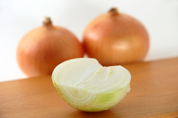 - 玉ねぎは、繊維に直角に2mm幅に切り、ざるに入れて薄力粉をまぶし、170℃の油できれいなきつね色(約4分)に揚げて油を切る。