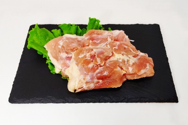 - 鶏もも肉は、1枚を半分に切り、厚さを均等に広げ、包丁の元の部分で細かくたたく。