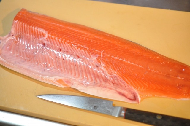 - 鉄板を火にかけて熱くし、油適量敷いて鮭を皮目を下にして焼く。