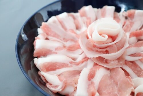 - 野菜をゆでた湯で豚肉をゆで、キッチンペーパーで水気をふく。