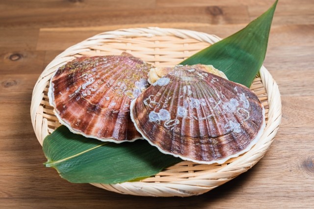 - ホタテは貝ごと焼き、口が開いたら、バターとバジルの葉をちぎってのせる。