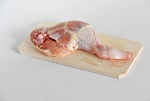 - 骨付き鶏もも肉は、足先を関節から切り、肉を開いて中骨を取り、2つに切る。